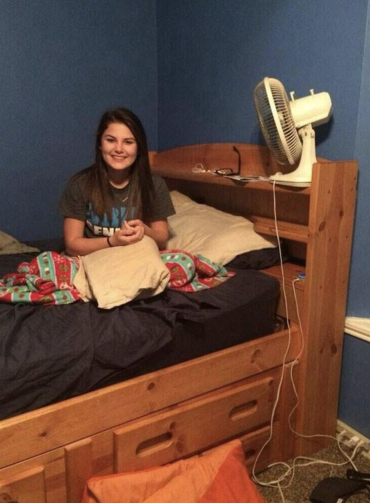 La joven aparece sentada en la cama, relajada, sonriendo para la cámara. Pero si se observa con atención, hay un detalle que puede pasar desapercibido para muchos… excepto para alguien que conoce bien su entorno.