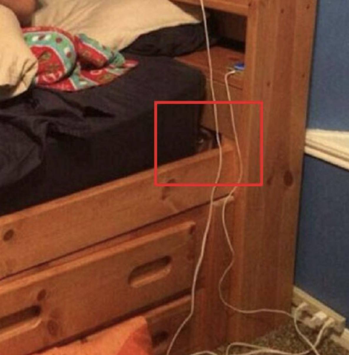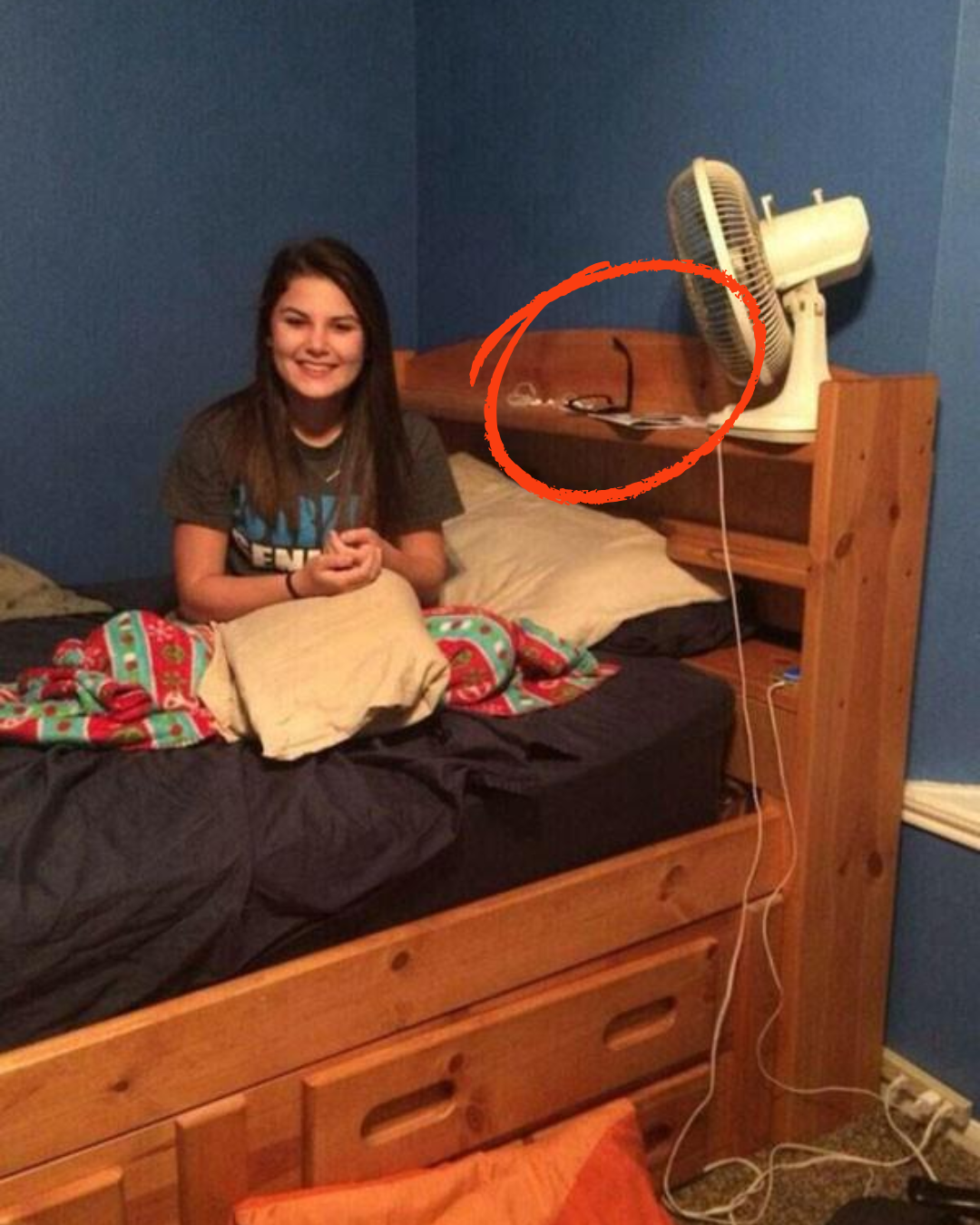Sobre la mesa de noche, junto a lo que parece ser el cargador de un celular, se pueden ver unas gafas de hombre. El problema: esas gafas no pertenecen al esposo.