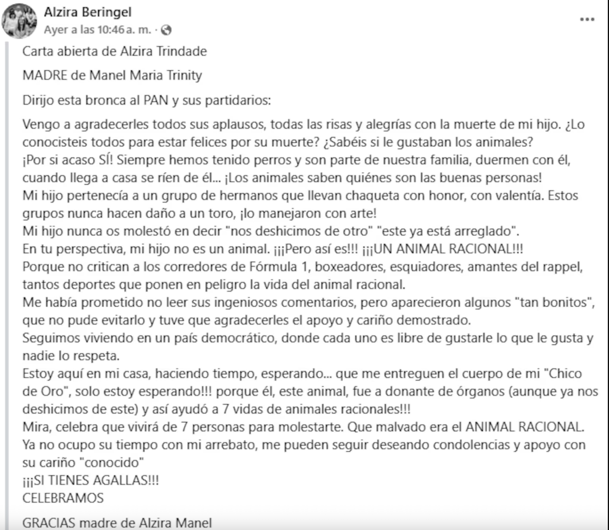 Su madre, en un emotivo mensaje, resaltó el amor de su hijo por los animales y la vida, destacando que gracias a la donación de órganos se pudo brindar esperanza a varias personas que aguardaban una oportunidad médica.